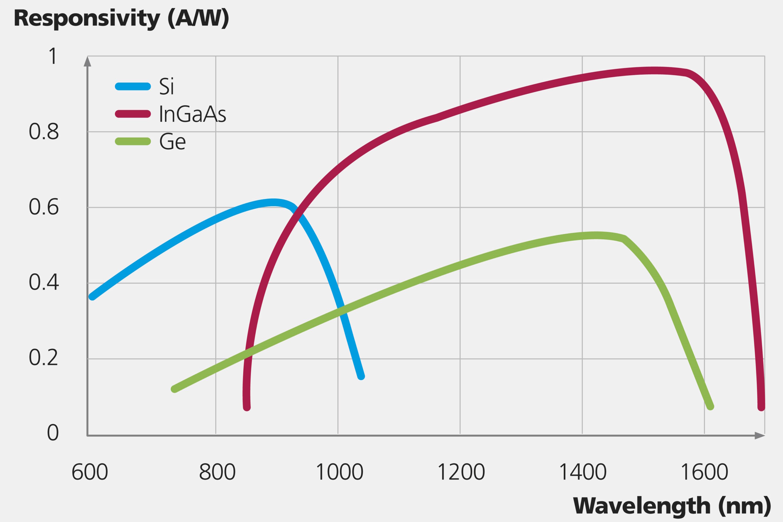 Different materials are better (i.e., more responsive) at different frequencies. For example, silicon (Si) is well-suited for applications like LiDARs operating at 900nm wavelengths, but it’s ineffective in the near-infrared. By comparison, germanium (Ge) isn’t bad around 1400nm, but it doesn’t compare with silicon at 900nm. However, the sweet spot for 1550nm is the compound semiconductor indium gallium arsenide (InGaAs).