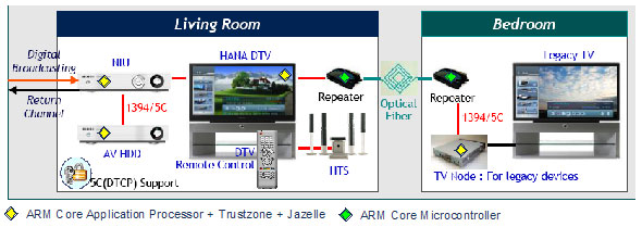 As a contributing member of HANA, ARM will be playing a major role in making the digital den (or living room) a reality. Consider a scenario that includes a fairly state-of-the-art entertainment system in the living room and an older TV in the bedroom.