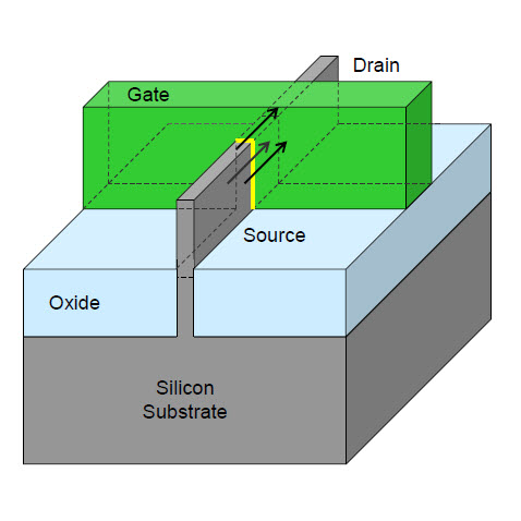 Configured like this, with gate oxide (and a gate electrode) on all three sides, you have what Intel calls a tri-gate transistor. Which is slightly different from the type of FinFET where the oxide over the top edge isn’t gate oxide, but rather field oxide, so it doesn’t act as a gate. In that case, the gate is active only on the left and right sides, not the top, so it’s not a tri-gate.