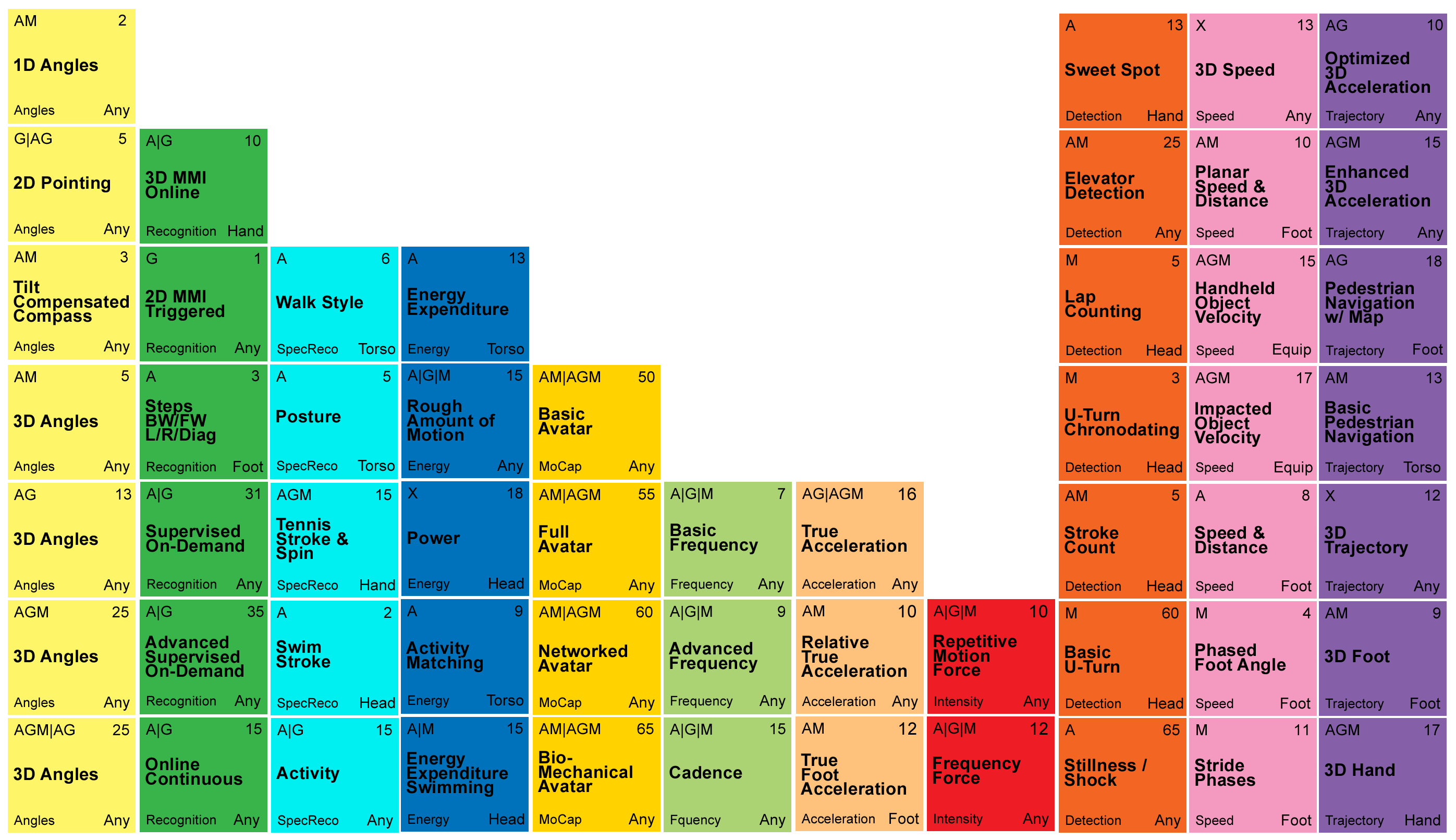These are examples of the low-level modules – the atoms – that come together as applications – or molecules – in ways that depend specifically on the application. They’ve continued the chemistry theme into the design tool realm, where their “MoveaLab” is described as a “chemistry kit for designing the signal processing flows from sensor data to features.” With 49 blocks shown in their periodic table, you can build lots of combinations, although the lower-row items build on the upper-row functions, rendering some combos nonsensical. Still, they illustrate one “molecule” with 26 atoms, many of which are basic (gyro calibration, for example, or a Butterworth filter), and a few of which are higher level (like “orientation integration”).