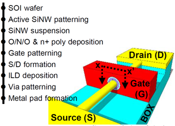 Figure 1. Fabrication of the SONOS device. (SiNW = silicon nanowire; ILD=inter-layer dielectric.) (Image courtesy IEDM – Click to enlarge)
