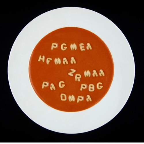 The overall resist soup is made, in at least one recipe, by taking, say, HfMAA, and dissolving it (at 5-10%) into PGMEA – propylene glycol methyl ether acetate (yeah, let that one roll around your tongue a few times), apparently a common coating solvent – and then adding 1-10% of a photoactive compound. That latter bit can be either a photoinitiator, like DMPA, which creates free radicals when exposed to light, or a PAG.