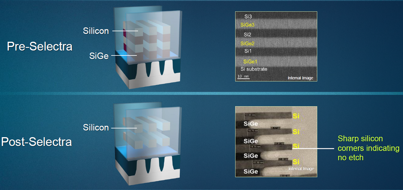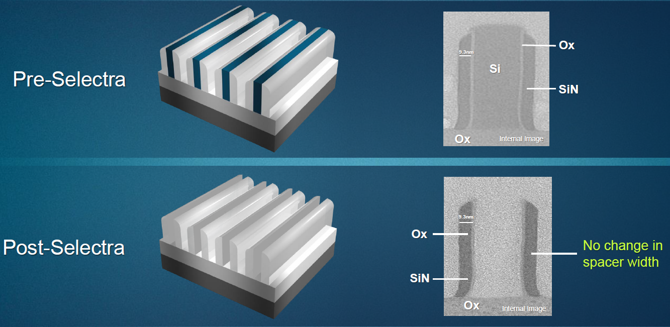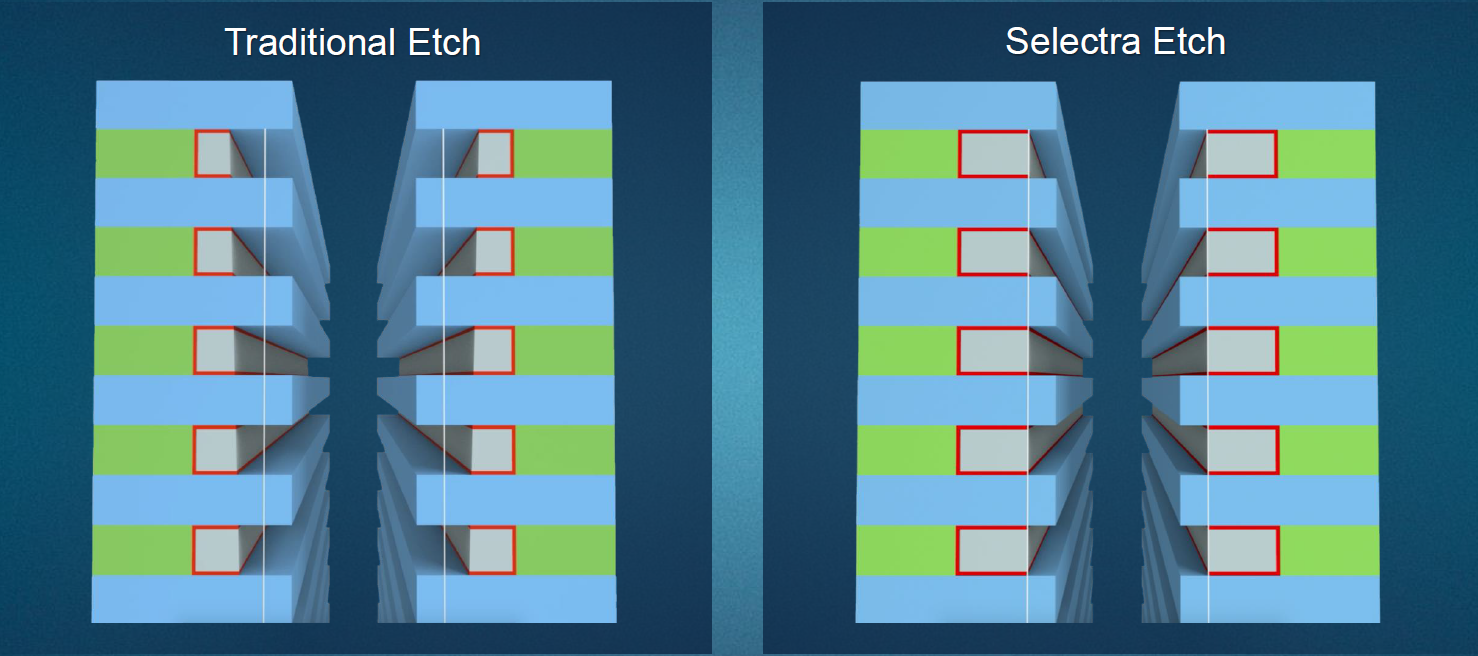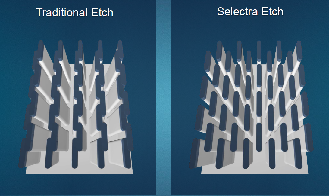 So AMAT’s Selectra system addresses these past issues. You might wonder, if we’ve done just fine so far, why is this all of a sudden a problem? Well, nothing is “all of a sudden,” but we’re now crying “Uncle” based on a few specific scenarios – at least. Selectivity is key for high-fidelity formation of multi-patterning guides; it’s also important for forming gate-all-around (GAA) structures – useful for post-FinFET transistors. Precise lateral etching is really useful for forming complex 3D NAND pillars. And the HAR thing is needed for future DRAM capacitor formation.