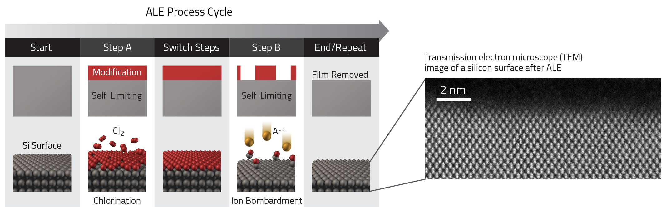 Meanwhile, Lam Research has also announced ALE. And their approach is completely different – and much more like standard ALD. They use a two-step process that starts with a precursor that binds to the top surface; they then bombard with something else to knock off that first layer – and nothing below it. For silicon, they use chlorine gas as the precursor, with argon ions then used for the actual removal.