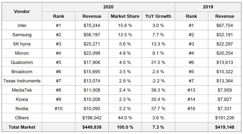 Intel and the three next biggest vendors all maintained their relative positions atop the sales charts. Qualcomm and Broadcom swapped 5th and 6th places, and Texas Instruments held steady in 7th. The biggest gainers were MediaTek and nVidia, which both grew by a whopping 38% in one year. That catapulted MediaTek from 13th to 8th, while nVidia jumped to 10th from its 16th place position last year. Kioxia, the flash memory spinoff from Toshiba, also moved up the charts from 14th last year to 9th this year. STMicroelectronics, NXP, and Apple all fell out of the Top Ten compared to 2019.