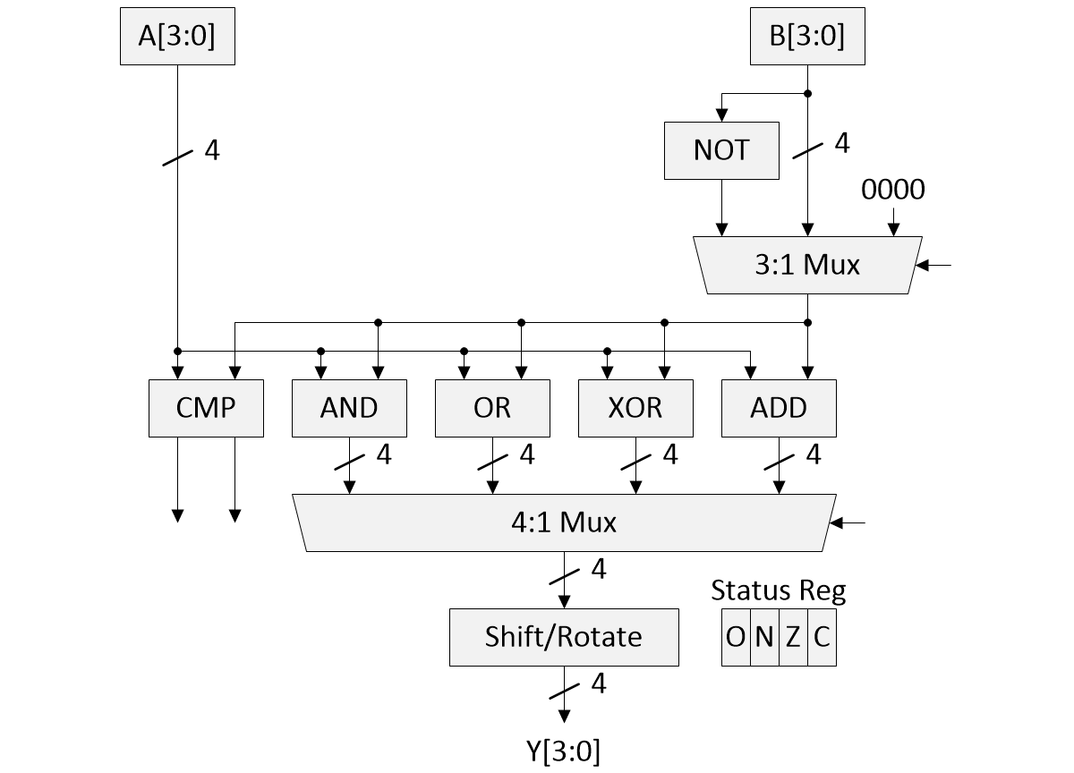 The ALU should be capable of supporting 16 operations: ADD, ADDC (add with carry), SUB, SUBB (subtract with borrow), AND, OR, XOR, NOT, CMP (compare), SHL (logical shift left), SHR (logical shift right), SHRA (arithmetic shift right), ROL (rotate left), ROR (rotate right), ROLC (rotate left through carry), and RORC (rotate right through carry).