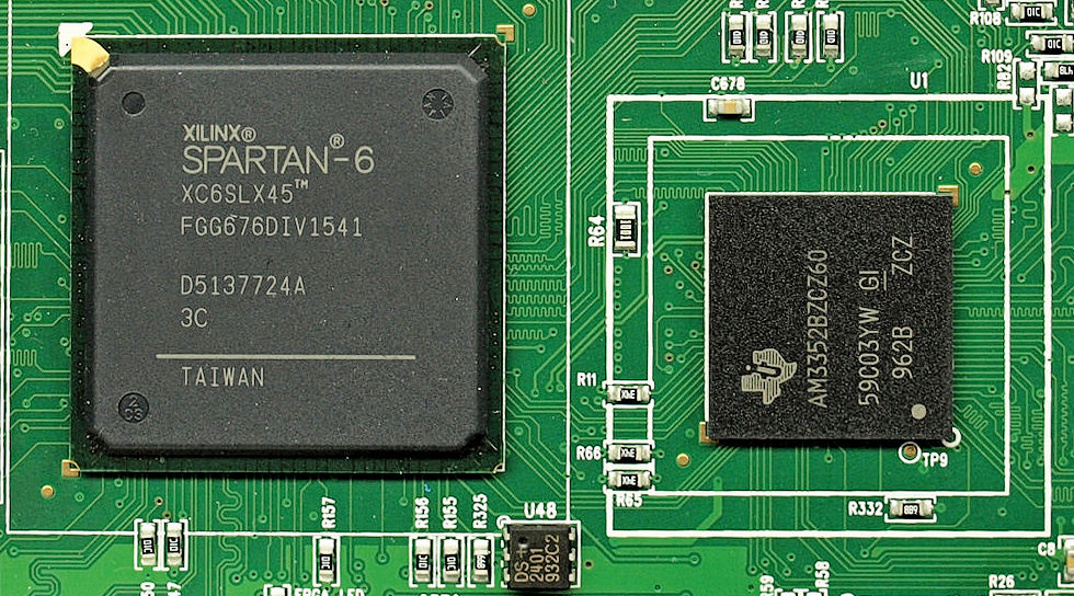 Figure 3: The TI Sitara application processor (on the right) and the Xilinx Spartan-6 FPGA in the Siglent SSA3012X spectrum analyzer are packaged in BGAs, which will increase the main pcb’s fabrication cost. (Image Source: Dave Jones/EEVblog.com)