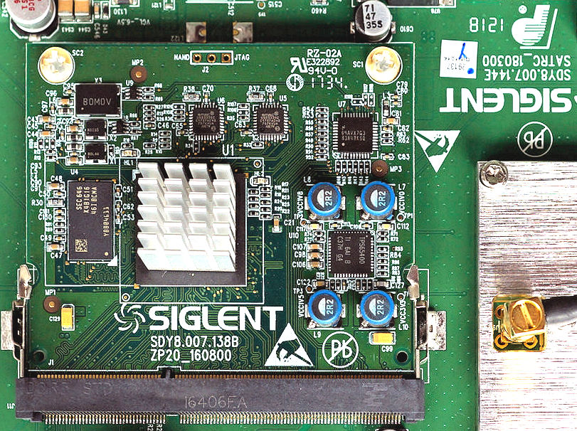 I counted the connector pins at the bottom of the photo in Figure 4, and it appears that Siglent has employed a standard, 204-pin DDR3 SODIMM socket for its daughter card (obviously sourced from TE Connectivity, based on the logo stamped on the right side of the connectors in Figure 4 above). Repurposing an existing, well-proven, high-volume connector technology in this manner represents very cost-effective engineering design.