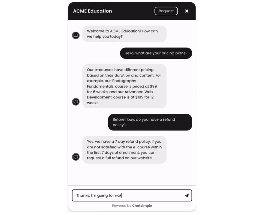 Example Chatsimple-powered chatbot (Source: Chatsimple)