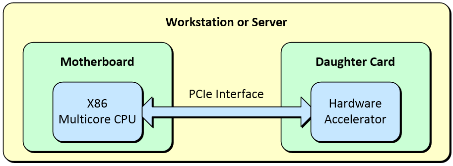 A very common way to implement hardware acceleration is to augment an X86-based motherboard in a workstation or a server with a daughter card connected via a PCIe interface.