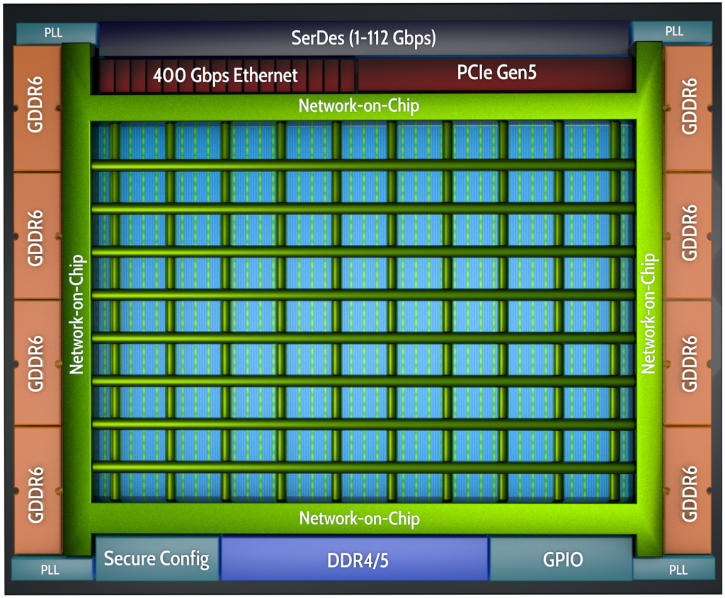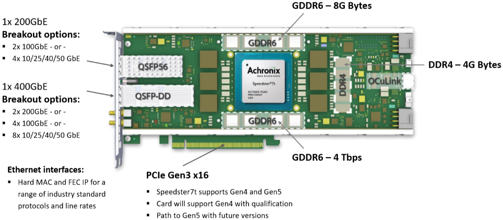 Let’s start with the Achronix 7nm Speedster 7t FPGA, which resides at the heart of the VectorPath card. The Speedster7t FPGA is optimized for high-bandwidth workloads, and it eliminates the performance bottlenecks associated with traditional FPGAs. Built on TSMC’s 7nm FinFET process, Speedster7t FPGAs feature a 2D network-on-chip (NoC), an array of new machine-learning processors (MLPs) that are optimized for high-bandwidth and AI/ML workloads, high-bandwidth GDDR6 interfaces, and 400G Ethernet and PCI Express Gen5 ports, all of which are interconnected to deliver ASIC-level performance while retaining the full programmability of FPGAs.