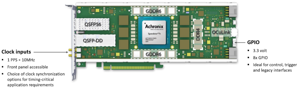 One thing that really impressed me about the VectorPath is that its creators obviously knew what they were doing; for example, they designed it to be scalable from a single card to many-card installations. This is evidenced by things like the clock and GPIO expansion interfaces. In particular, the OCuLink interface supports NVMe access (interface directly with NVMe Flash arrays for database acceleration and big data applications), card-to-card scaling (scale independently of the PCIe bus, with a deterministic, low-latency, high-bandwidth interface), the ability to add extra network ports, and the ability to retrofit older systems by integrating new technology using protocol-agnostic serial I/O.