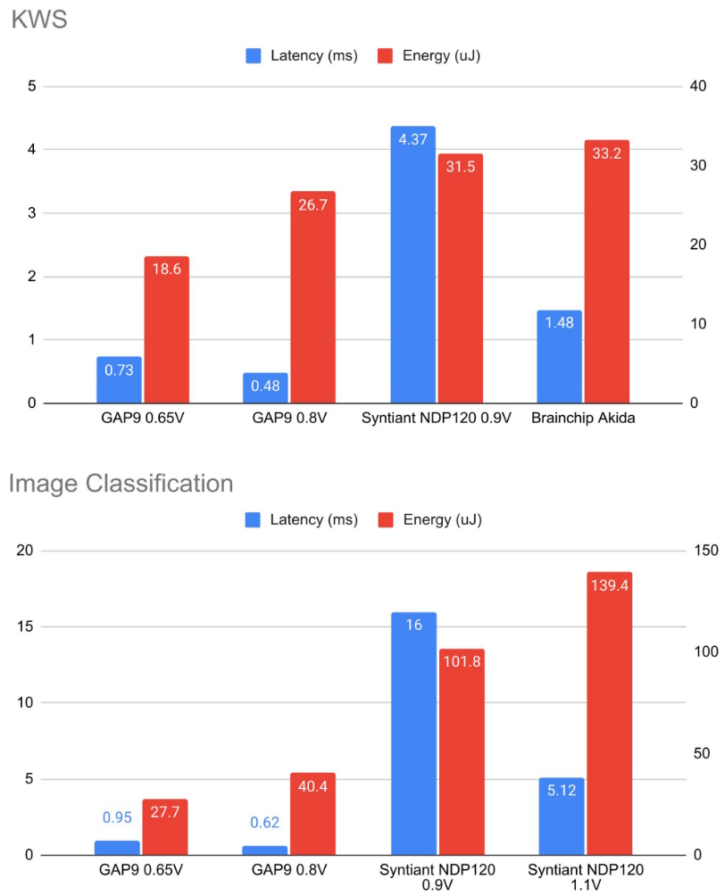 The results were that the GAP9 consumed ~2 to 3X less energy than a highly specialized analog neuromorphic chip and ~2 to 4X less energy than a specialized neural network accelerator chip, all while providing the lowest latency in all the tests.
