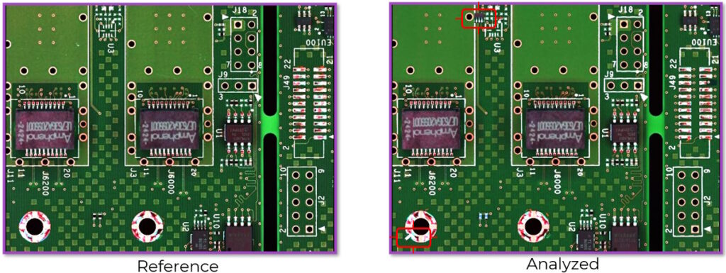 PCBA facilities also have automated optical inspection (AOI) machines that take high-resolution pictures of the top of the board. Pre-reflow AOI checks the solder paste application before the soldering process takes place, but we don’t care about that here. We’re interested in post-reflow AOI, which inspects completed boards for assembly defects after components are soldered. This uses image processing algorithms to examine things like