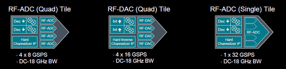 Two of these tiles consist of four integrated ADCs and four integrated DACs respectively. One of these quad tiles contains four 8Gsamples/sec RF-ADCs, and the other contains four 16Gsamples/sec RF-DACs. The final tile contains one RF-ADC capable of 32Gsamples/sec conversion rates. The RF-ADC tiles incorporate hardened channelizers, which break the conversion stream into lower-rate channels and hardened decrementers. The RF DAC tiles incorporate hardened channelizers and hardened incrementers. The hardened decrementers and incrementers support DDC (digital down conversion) and DUC (digital up conversion) operations. The RF-ADCs also support programmable decimation (periodic sampling) by as much as 80x.