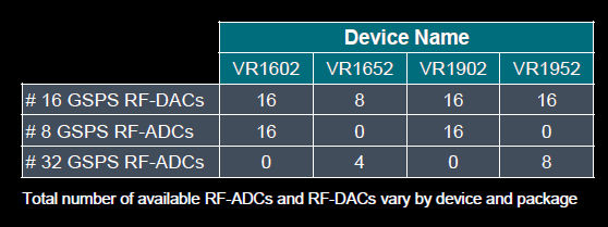 The table below shows how many of each type of analog converter you get in each of the four planned Versal RF FPGAs.