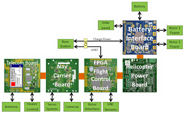 The FPGA manages the helicopter’s power and its operational state, switching the other avionics elements on and off as needed to maximize power conservation. The FPGA also implements thermal control of the helicopter’s survival and operational heaters and monitors and balances the lithium battery’s cell voltages. Because it is only one of two continuously powered elements in the helicopter, the FPGA also maintains precise spacecraft time, implements alarm clock functions, and generates real-time interrupts for the rest of the system.