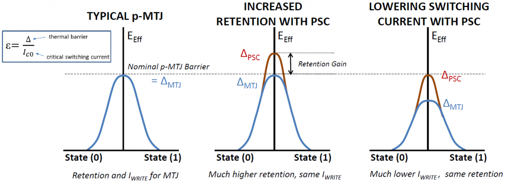 The key here is the thermal barrier, effectively the barrier to switching, which keeps the state from degrading, directly impacting data retention. By adding this new PSC structure, that barrier goes up such that efficiency grows by 44%. This provides two opportunities: on the one hand, a higher barrier raises data retention – by 2-4 orders of magnitude. Alternatively, if you compensate for that higher Δ by lowering the switching current, you get the same overall efficiency as you had before, only now using less current to set the state of the cell.