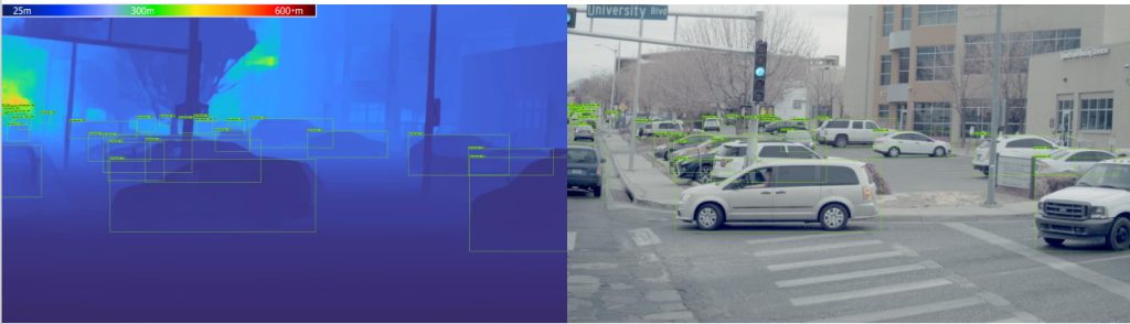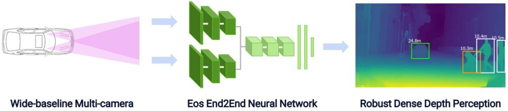 Eos robust depth perception software addresses these limitations by robustly providing dense depth detection combined with accurate perception capabilities to determine distance and elevation even out to long distances (e.g., 1 kilometer). Eos also provides the ability to identify objects, pedestrians, or bicyclists, and even lost cargo or other hazardous road debris to further improve driving safety. These modular capabilities provide rich 3D scene reconstruction and provide a highly capable and cost-effective alternative to lidar, radar, and today’s existing stereo camera approaches.