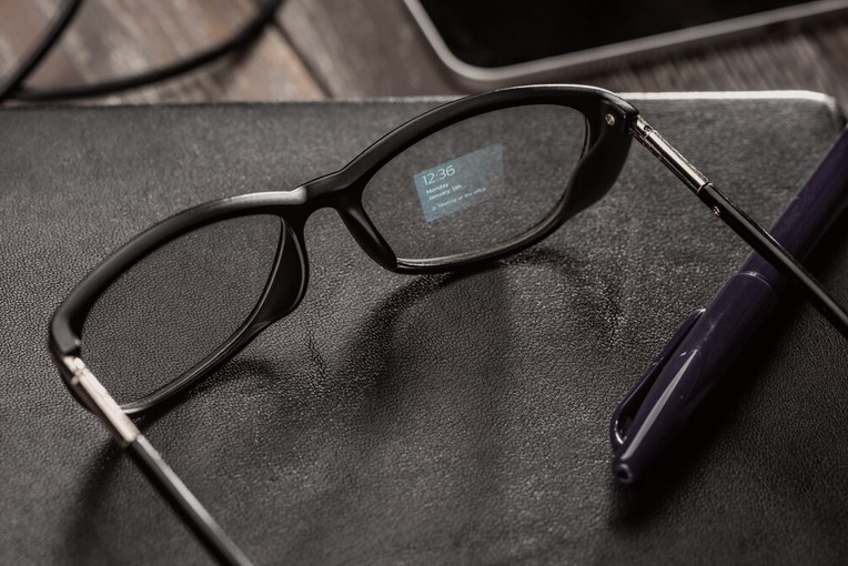The great thing about TOMs is that they can be integrated into all sorts of things, including prescription eyeglasses, safety goggles, microscopes, telescopes… the list goes on. In the case of eyeglasses, TOMs can be used to provide binocular displays or monocular versions as shown below. Even better, TOMs are scalable and can be created in curved forms, potentially replacing the entire eyeglass lens.
