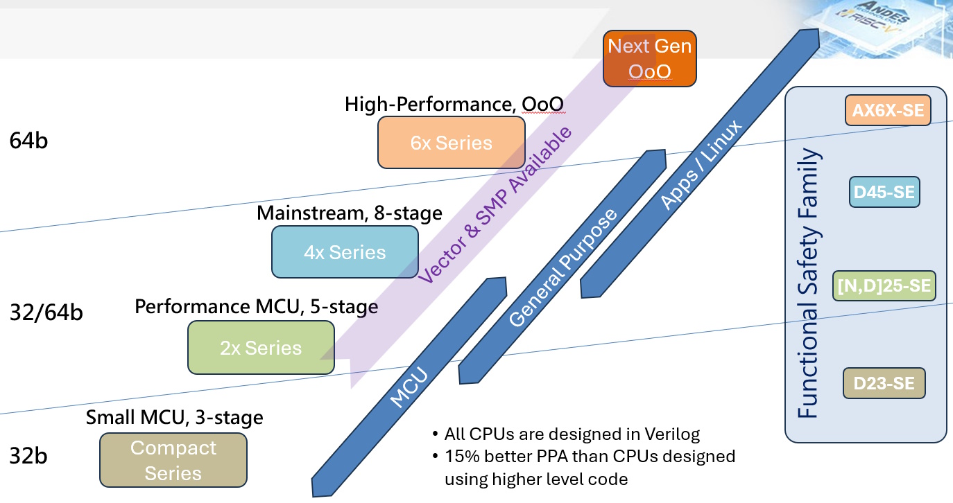 There are currently 30+ AndesCore RISC-V CPU IP cores available “off the shelf,” as it were. These range from 32-bit small MCUs with 3-stage pipelines, through 32b/64b dual-issue workhorse processors with 5-stage and 8-stage pipelines, to 64b quad-issue out-of-order (OoO) high-performance processors with 12-stage pipelines.