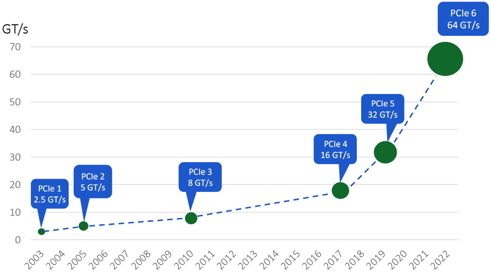 Since its inception, each new release of PCIe has doubled the bandwidth of the previous generation, so no major surprises there. As illustrated below, however, the time between releases reflects an inflection point circa 2017.