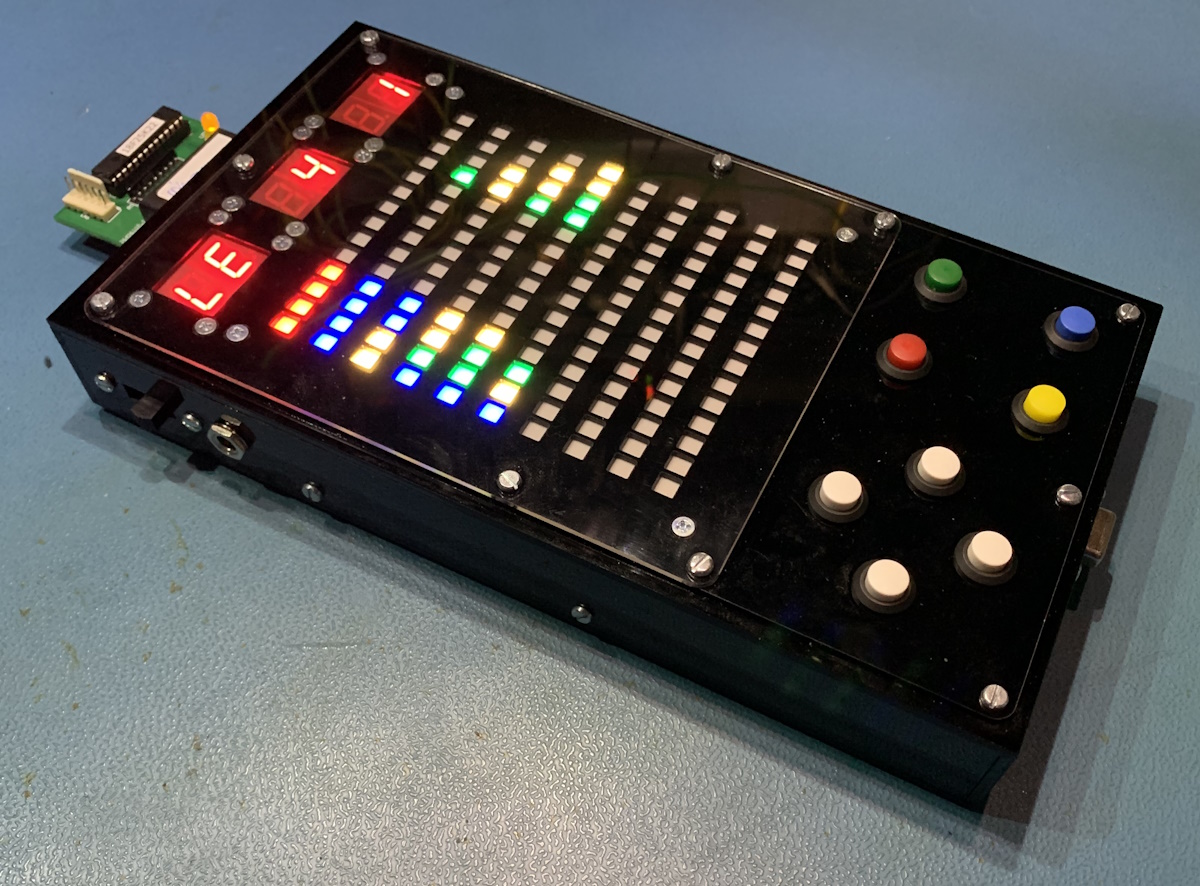 To be honest, there’s nothing in the main box apart from pushbuttons, 7-segment displays, a matrix of light-emitting diodes (LEDs), and a lot of wires. Any computing power is provided by a pre-programmed microcontroller mounted on a plug-in board (the green board seen in the upper left corner of the image).
