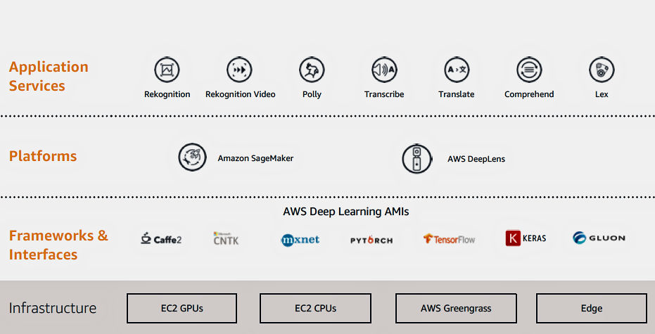 Atop this Amazon-designed infrastructure layer are the familiar AI/ML frameworks including Caffe2, mxnet, PyTorch, TensorFlow, and Gluon. These are the tools that AI/ML experts strongly prefer and use. However, AWS intends its services to be used by non-experts as well, so it has developed more layers to sit over the frameworks.