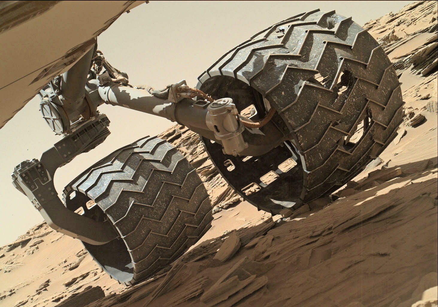 Figure 4: After more than six years of trundling over the Martian landscape, the Curiosity rover’s aluminum wheels are showing some wear. (Image credit: NASA/JPL)