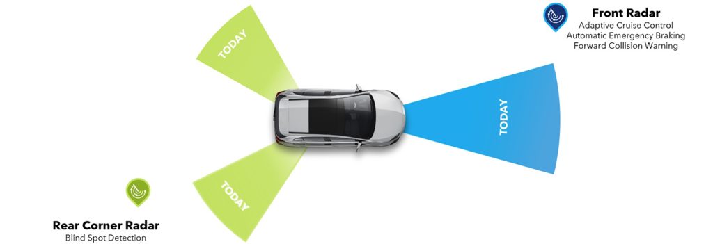 Having said all this, the focus (again, no pun intended) of my chat with Matthias was on radar only. He started by noting that, driven by safety mandates, most new vehicles over the past couple of years have been equipped with three radar sensors as illustrated below.
