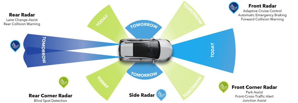 In addition to cars carrying more radar sensors, these sensors need to have greater range. For example, today’s forward radar sensors typically have a range of 200m, but this will soon increase to 300m or more. Similarly, today’s corner radar sensors typically have a range of 70m, but this will be increased to 140m or more.