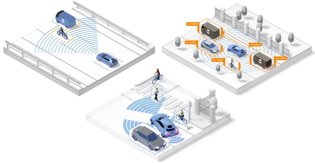 Better radar sensors unlock a range of possibilities, including weak target/VRU identification and separation (upper left) and advanced 4D elevation and multi-mode sensing (lower middle), all resulting in a 360° radar cocoon (upper right)