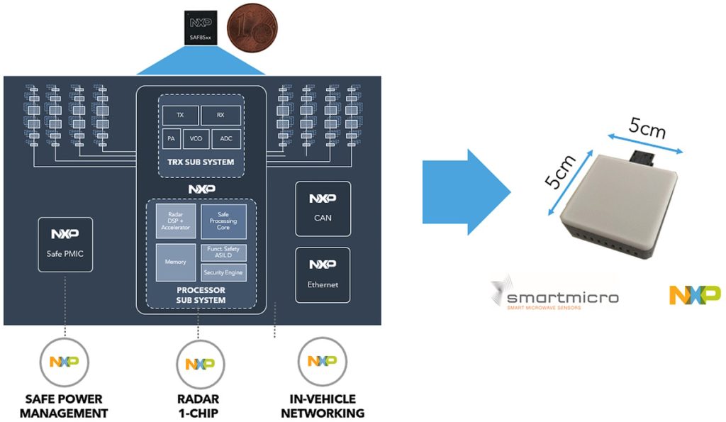 To be honest, it took me a few seconds to wrap my brain around the image above, but the 1/3 width column in the middle (with the “Radar 1-Chip” annotation) reflects the contents of the SAF85xx. Everything outside this is implemented using additional NXP devices.