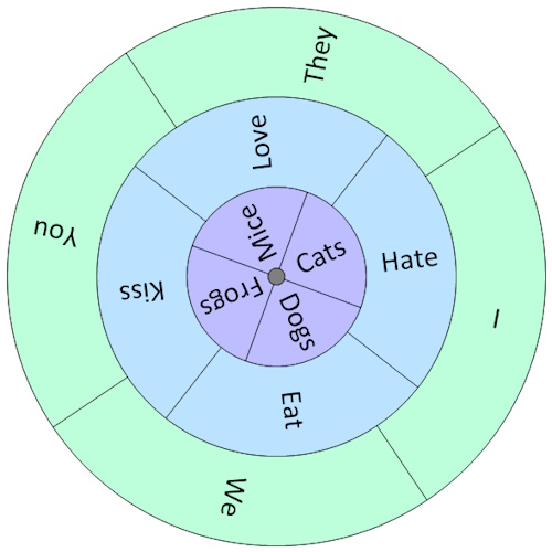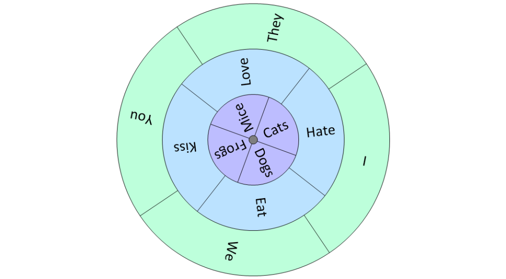 Lull’s idea was that each disk should contain a number of different words or symbols that could be combined in different ways by rotating the disks. In the case of our somewhat jocular example above, we can achieve 4 x 4 x 4 = 64 different sentences along the lines of “I love mice,” “You hate cats,” and “They [The French] eat frogs.”
