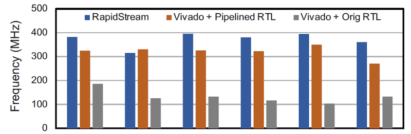 The RapidStream results are the blue bars, which show faster clock rates than all of the non-partitioned, non-pipelined versions of these designs. You’d expect that result. Pipelining is at the very core of clock-speed improvement in FPGA design. However, the RapidStream results are better than the pipelined RTL versions of the same design in five of the six cases. That result should really get your attention.