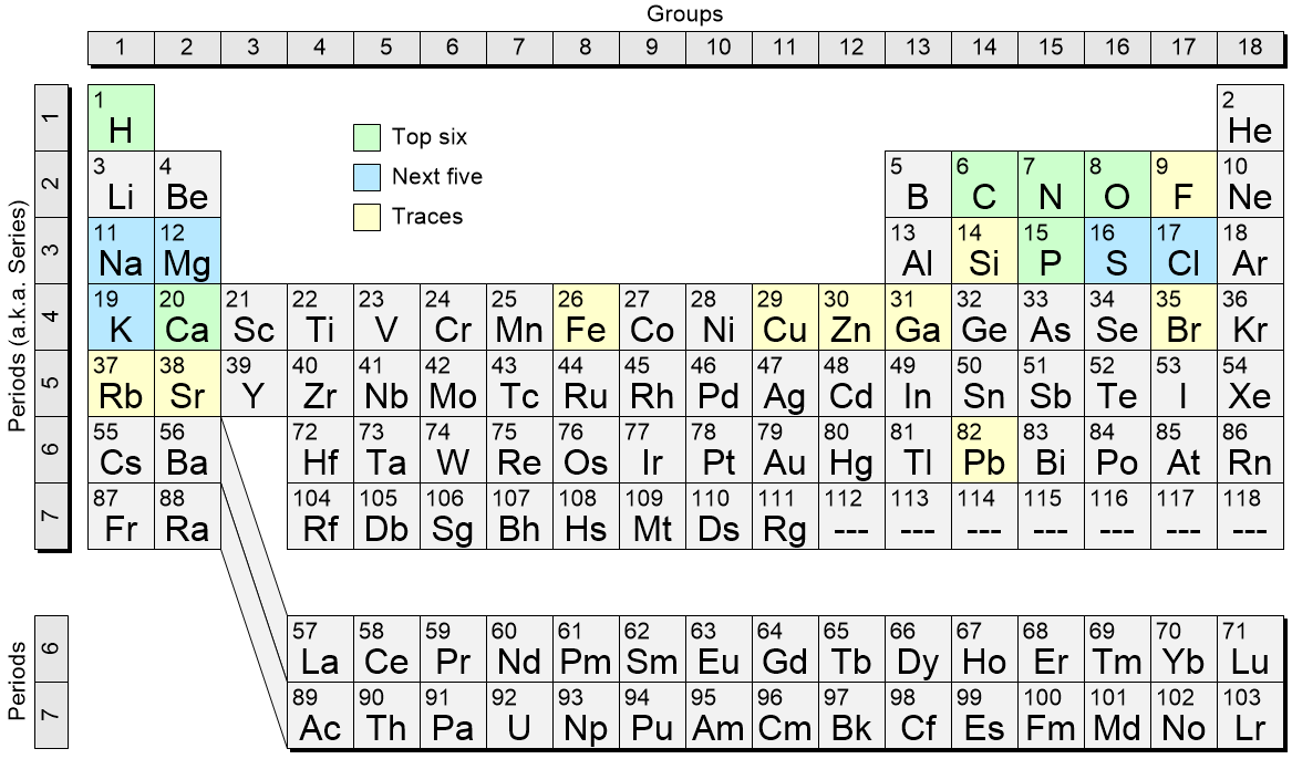 Returning to our original representation; have you ever wondered how many different elements go to form a human body? Well, according to the Wikipedia: “About 99% of the mass of the human body is made up of six elements: oxygen, carbon, hydrogen, nitrogen, calcium, and phosphorus. Only about 0.85% is composed of another five elements: potassium, sulfur, sodium, chlorine, and magnesium. All 11 are necessary for life. The remaining elements are trace elements, of which more than a dozen are thought on the basis of good evidence to be necessary for life. All of the mass of the trace elements put together (less than 10 grams for a human body) do not add up to the body mass of magnesium, the least common of the 11 non-trace elements.”