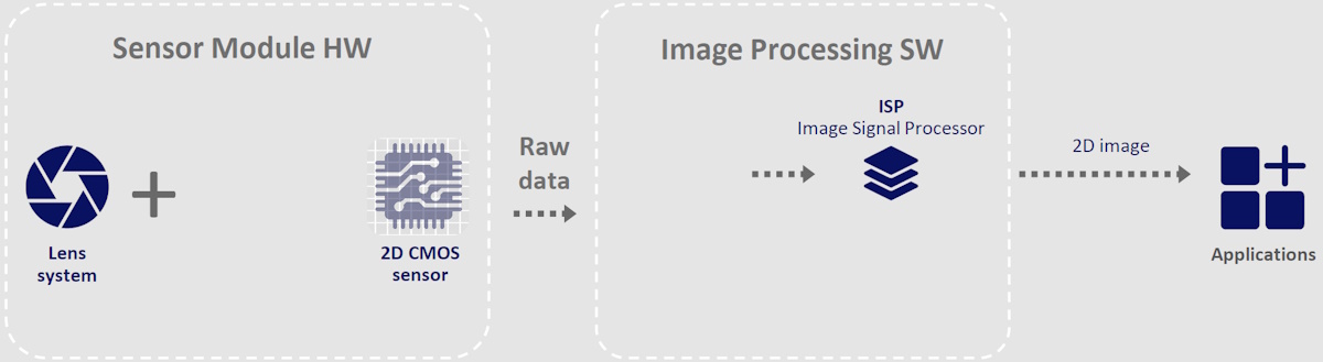 From left to right we have a lens assembly focusing light on a standard 2D CMOS sensor. The raw data from the sensor is fed to an image signal processor (ISP) that performs any computation required before passing the resulting 2D images to any downstream applications. The ISP algorithms can be implemented in software running on a processor or in hardware running in silicon.
