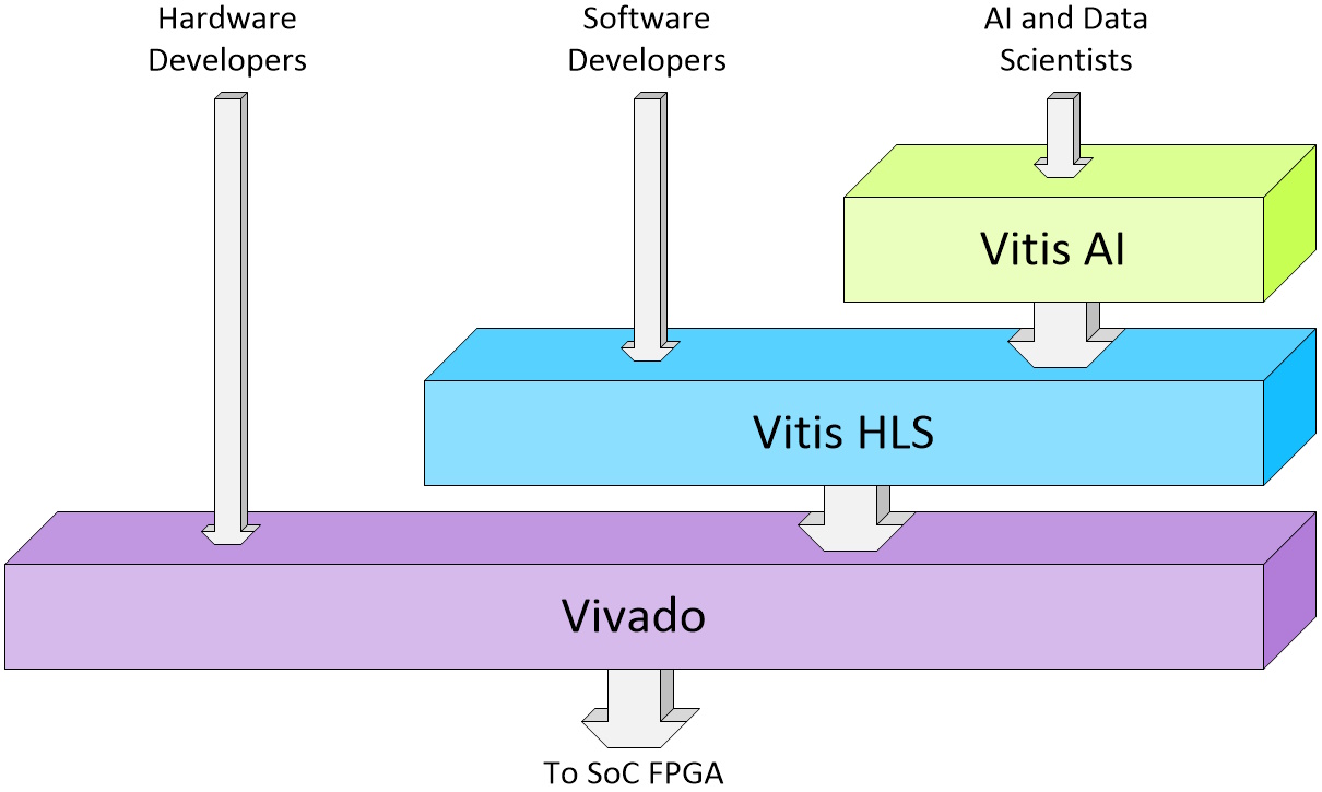 Another change that has taken place is the capacity and sophistication of the tools used to design these devices. My own simplistic view of the AMD/Xilinx SoC FPGA tool hierarchy is depicted below.