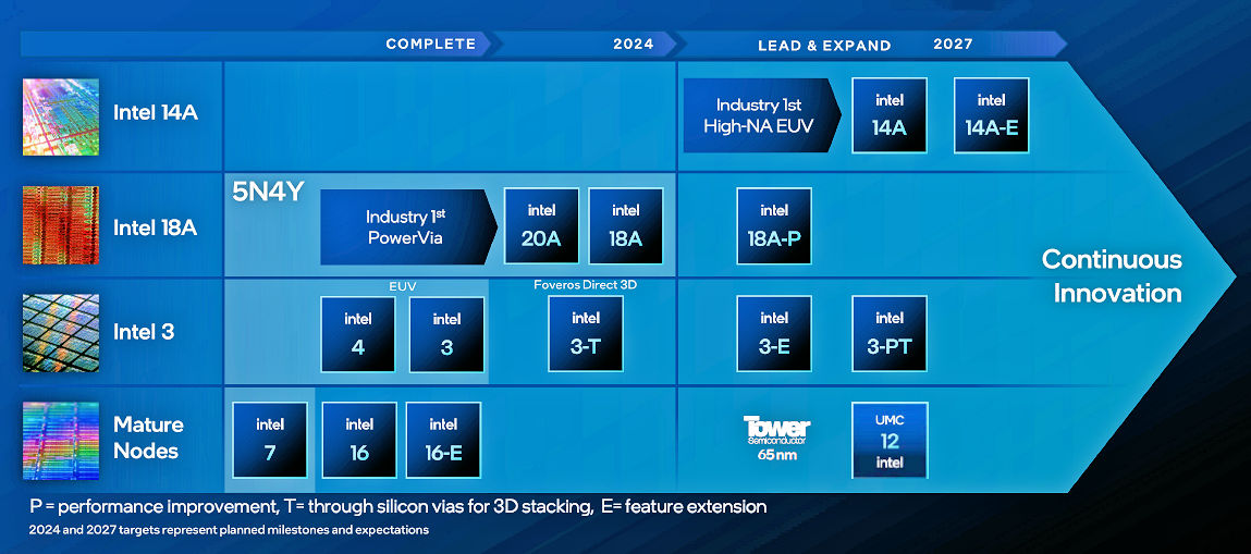 During the same talk, Gelsinger explained that Intel would augment many of the existing nodes with modifications that offer enhanced performance (P), through-silicon vias for 3D chip stacking (T), and feature extensions (E). These new intermediate nodes also appear in the above roadmap. The existing Intel 16nm, Intel 3, and Intel 18A process nodes will get process extensions, as will the yet-to-be-developed Intel 14A node. The roadmap also shows the 65nm planar BCD (bipolar-CMOS-DMOS) process node that Intel will be manufacturing for Tower Semiconductor, as announced last September, and the 12nm FinFET CMOS node that Intel jointly announced with UMC in January.