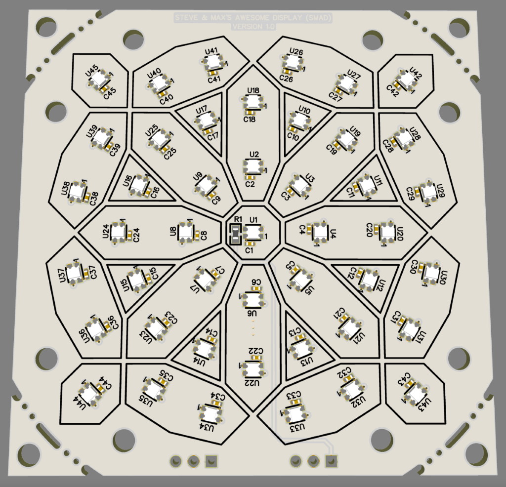 We started with 29-segment shells that map onto the outlines shown on the board above. This gave us 13 segments with one LED, and 16 segments with two LEDs each. Since the color of each LED can be individually controlled, we can implement all sorts of interesting effects with the 2-LED segments.