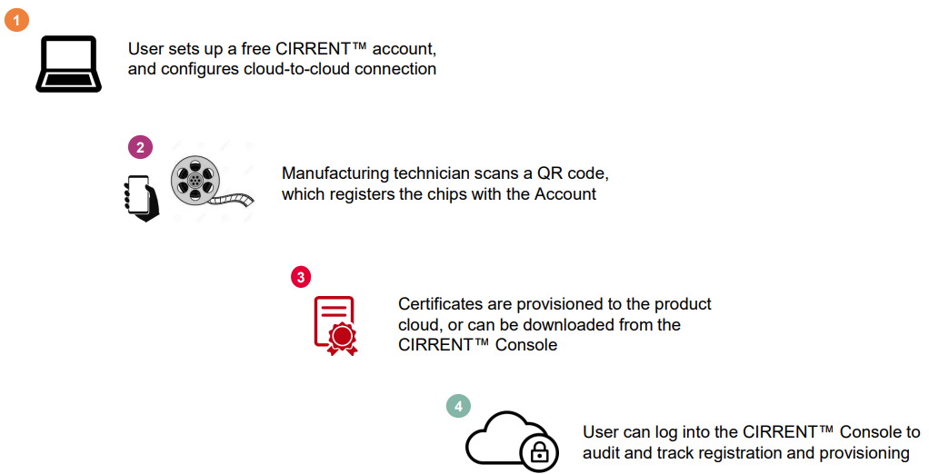 Cloud ID is quick and easy to set up. A user establishes a free CIRRENT account and configures cloud-to-cloud connection between the CIRRENT Cloud ID Service and their Product Cloud. A Cloud ID compatible batch of chips, containing X.509 certificates, is delivered to the manufacturing location where a technician registers them using a smartphone. The X.509 certificates are automatically provisioned to the product cloud. Users can log into the CIRRENT console to download their certificates, and to audit and track registrations and provisioning.
