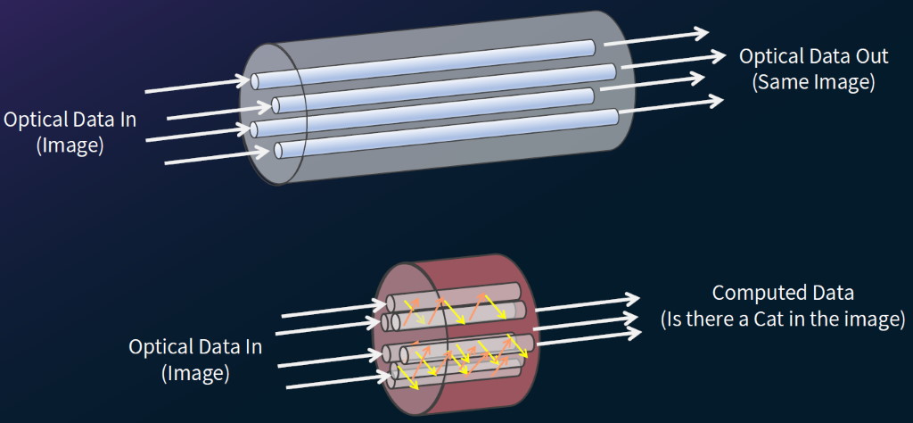This takes a little bit of wrapping one’s head around — to be honest, I’m still wrapping mine around it – but I’ll explain it as best I can. Let’s start with the following image. My knee-jerk reaction when someone says “fiber optics” is to think of an optical cable containing multiple optical fibers, but my understanding is that, in this case, we are actually talking about optical fibers containing hundreds or thousands of optical cores. In traditional applications, we try to keep any crosstalk between cores as low as possible. In the upper part of the image, for example, our input is an optical image, each of whose pixels is transmitted down a core, and our output is the same image.