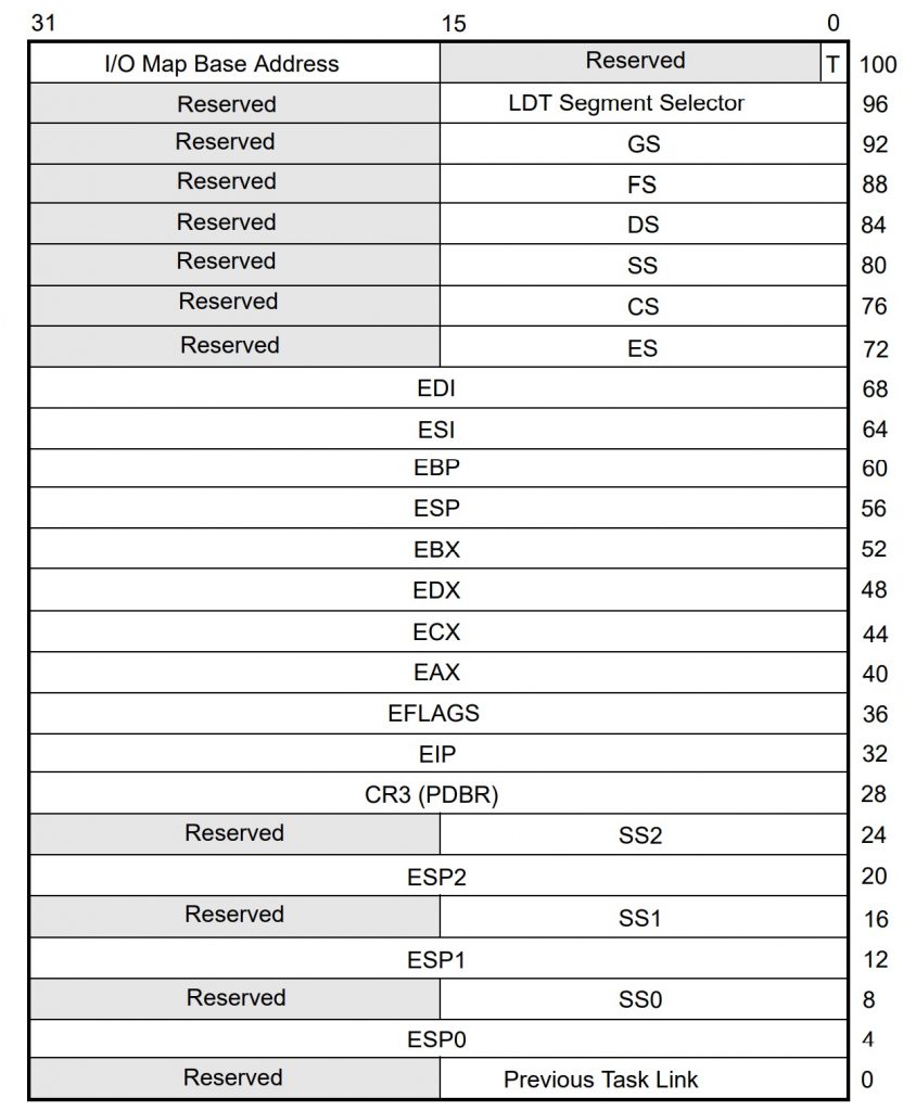 If you’re familiar with the x86 programmer’s model and register set, you’ll recognize most of the contents of the TSS. It has all the general-purpose registers like EAX and ECX, along with the segment registers (CS, DS, SS, etc.) as well as four stack pointers (one for each privilege level) – plus a few unfamiliar items. We’ll get to these in a bit.