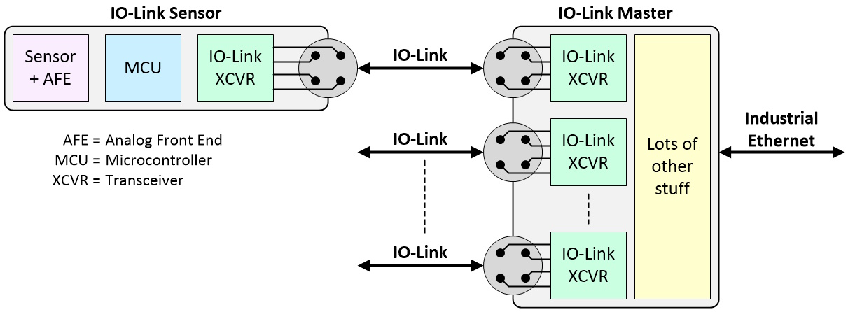 This is where I must take my hat off to the folks at Orca. They’ve focused their attention on a well-established technology with humongous growth potential, and they’ve identified a specific niche for their Analog ASSP expertise where they can do something better and cheaper than the incumbents (the ones we last saw nibbling their hors d’oeuvres, sipping their glasses of port, and smoking their cigars). Consider a typical IO-Link block diagram with a sensor at one end of the link and an IO-Link Master at the other as illustrated below.