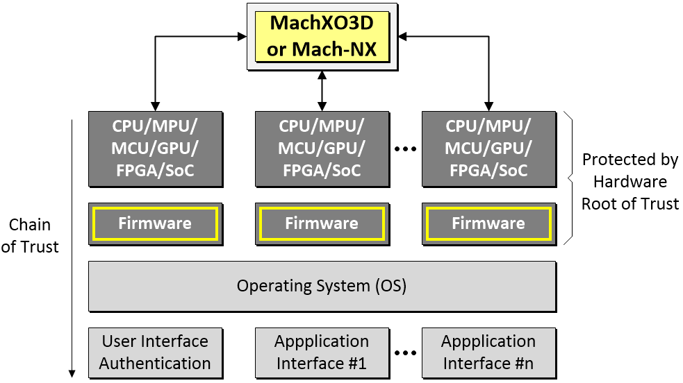 MachXO3D/NX devices fully address cyber-resiliency and PFR requirements by providing features such as their secure dual-boot capability, which means control will be passed to a new encrypted image only after it has been fully authenticated. These devices can also act as the system’s hardware root-of-trust (HRoT). Upon system power-up, the MachXO3D/NX first checks itself to make sure only authenticated firmware is running on it, after which it can check and verify the firmware associated with all of the other devices in the system, refusing to release those devices until it has verified the bona fides of any firmware associated with them.