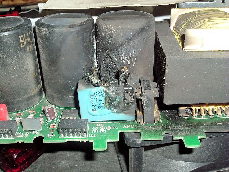 Here’s yet another exploded film capacitor, accompanied by a physically damaged transformer. (Image Credit: APS)