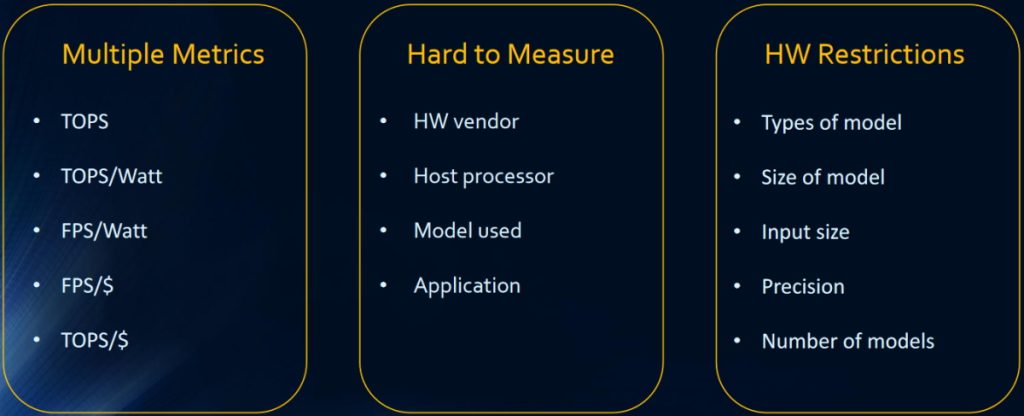 Even the simplest things can be hard to measure, and the aforementioned terms don’t mean the same for everyone. One AI accelerator’s data sheet may quote twice the TOPS of someone else’s offering, but that doesn’t mean the end application will run twice as fast.