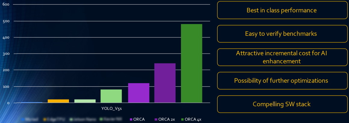 The results from YOLOv5s using single, dual, and quad ORCA-NNX implementations are shown in the three columns on the right. As we see, even a single ORCA-NNX outperforms its nearest competitor.