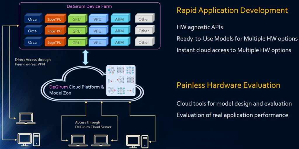 All of this is addressed by the DeLight Cloud Platform. First, we have the DeGirum Device Farm which includes ORCA-NNX platforms from DeGirum, Edge TPUs from Google, and GPU lines from Nvidia, along with VPUs (a general term for accelerators coming out from Intel), ARM-based SoCs, and others that will be added as their hardware and software becomes more widely available.