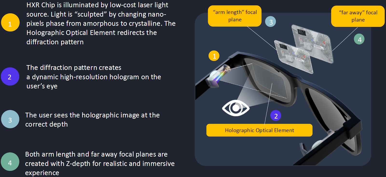 Illuminated by red, green, and blue laser sources, this sea of nano-pixels can generate dynamic holographic images that appear not just in front of the user, but at different depths in space—from arm’s length to optical infinity—creating a viewing experience that finally behaves the way human vision expects the world to behave.